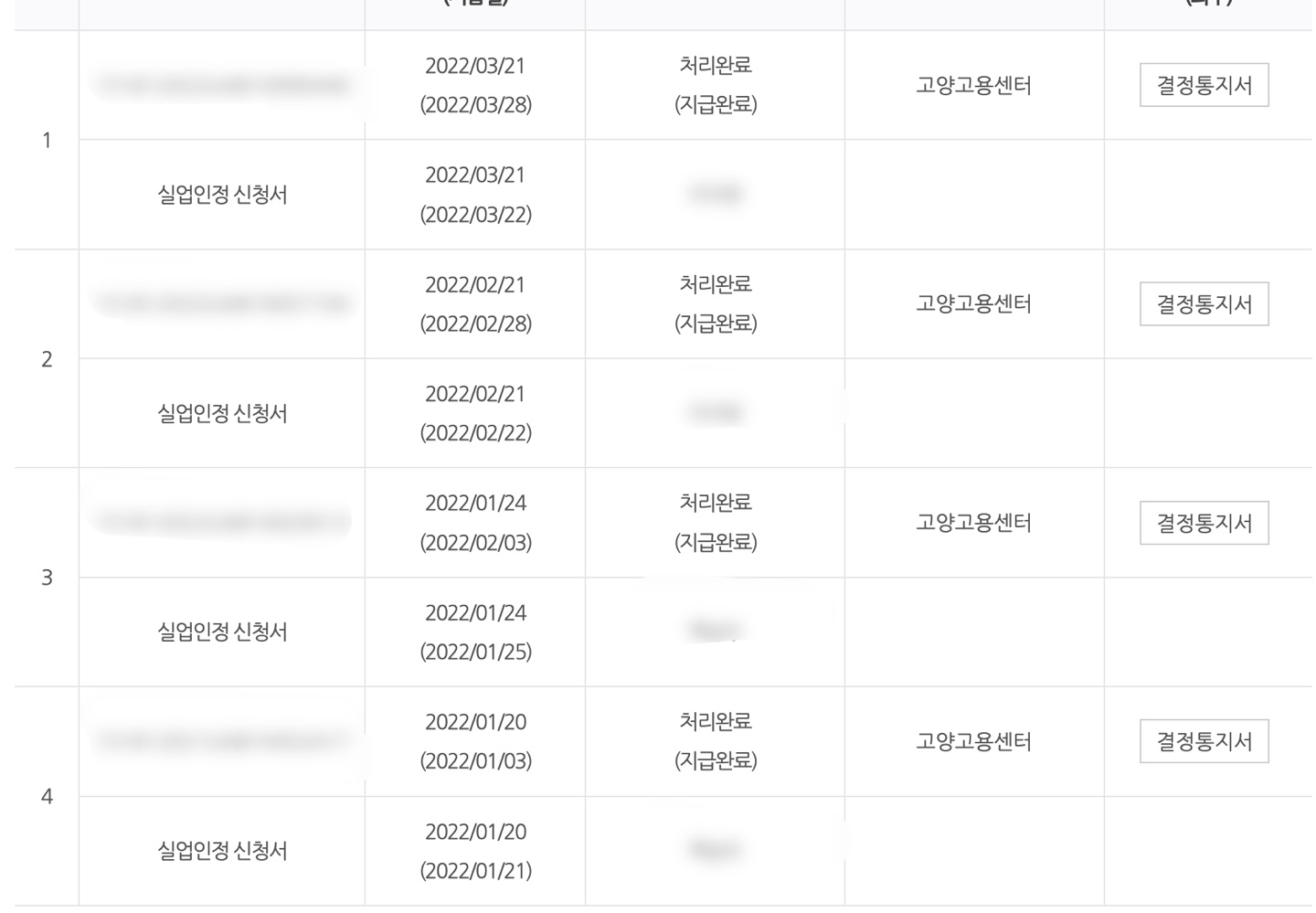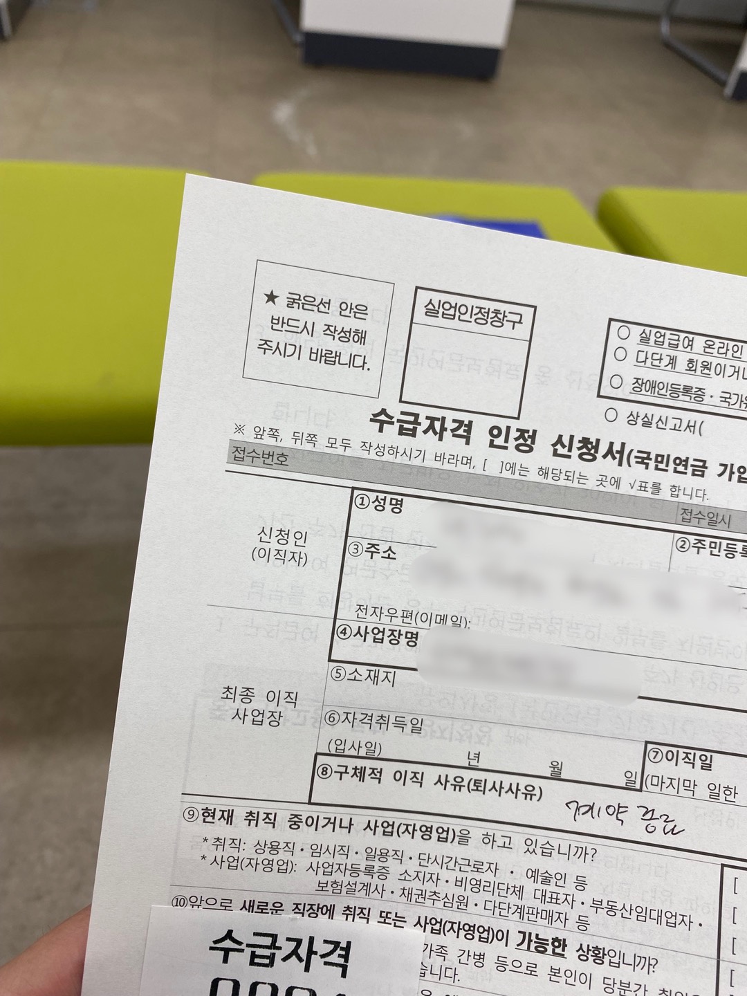 - 거주지상 관할 고용복지센터 방문하여 실업급여 신청 - 신분증 필수 지참, 번호표 뽑고 대기하면서 수급자격 인정 신청서 미리 작성하기